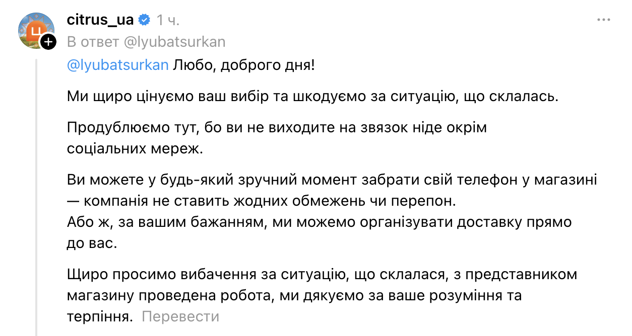 Але наступного дня "Цитрус" повністю змінив тон і написав відповідь сестрам, яких напередодні називав "не справжніми клієнтами": "Ми щиро цінуємо ваш вибір та шкодуємо за ситуацію, що склалась. Ви можете у будь-який зручний момент забрати свій телефон у магазині".