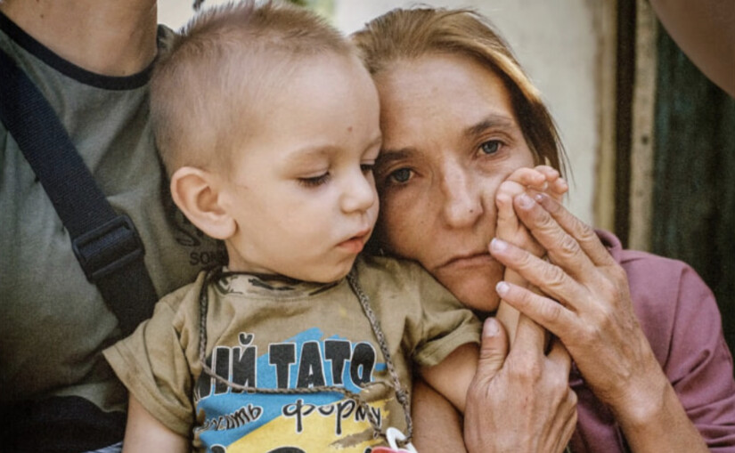 Допоможіть журналістам Vgorode.ua виконувати свою роботу. Підтримайте фінансово >>> ❤На знімку хлопчик Тимофій Цвєтков у футболці з написом "Мій тато носить форму ЗСУ", якого за руку тримає його тітка Ольга Грінік. Поки батько Тимофія був на війні, рідне місто його родини поблизу лінії фронту захопили російські військові, тому родина втекла до села в центральній Україні, де у них є родичі.