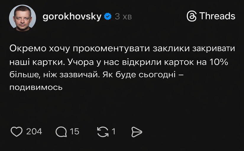 Частина клієнтів на знак протесту почала закривати картки — у мережі з'явилась хвиля скриншотів закритих «чорних» карток. Але Гороховський у відповідь написав, що за добу після скандалу нові картки monobank відкрили на 10% більше, ніж зазвичай. Схоже, вибачення і статистика — це було одне й те саме повідомлення.
